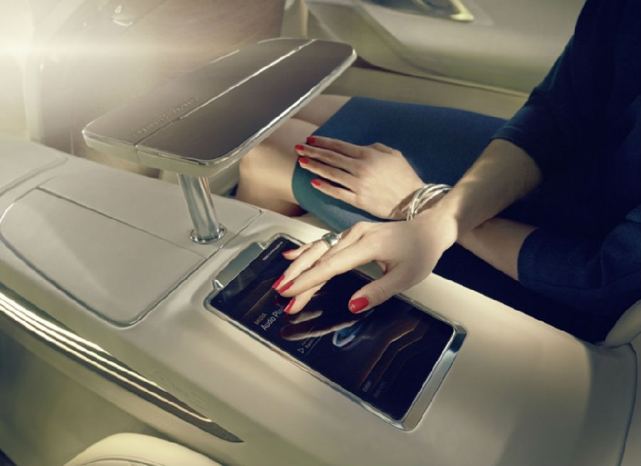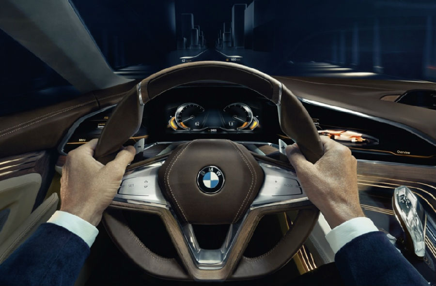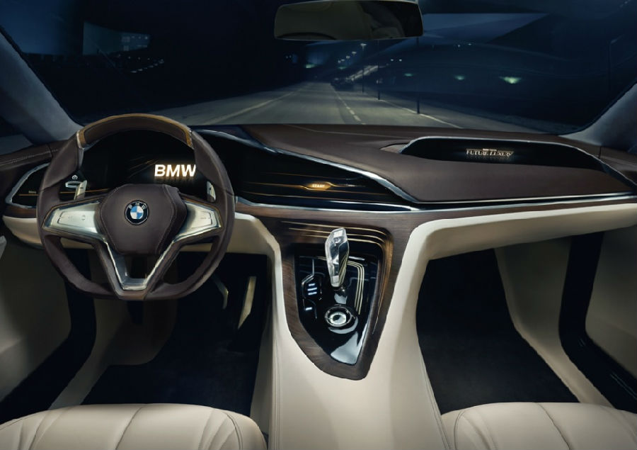 在车厢内部,全新宝马Vision Future豪华概念车型的主要亮点为在中控台处采用了三屏式显示。中控台左边的一块显示屏替代了传统仪表盘,用来显示相关行车信息,如油耗等。中控台正中位置处的显示屏用来显示包括车速、引擎转速、自适应性补充数据等信息,而中控台右边的一块显示屏用来提供多媒体信息。该全新概念车使用了宝马公司最新研发的Vision抬头显示系统,该系统可以允许驾驶者在不分散驾驶注意力的同时实时获得车辆的行车信息。此外,宝马公司还为后排乘客提供了两块触摸显示屏,并可通过一个可移动的远程控制版来选择在这两款屏幕上播放的多媒体信息,这些多媒体信息几乎涵盖了所有的方面,从汽车车速到行程规划,从网络多媒体信息到音乐、视频、游戏等。