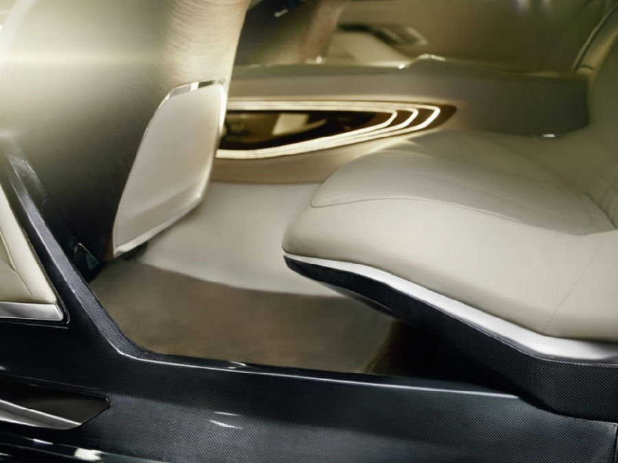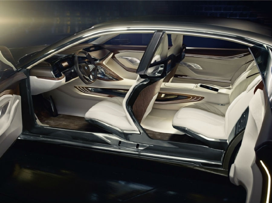 在车厢内部,该车型采用了三明治式的轻量化结构,在提升车厢刚度的同时有减轻了整车的重量。在该三明治式轻量化结构中,首层为碳纤维材质,其用来进行塑形、支撑等;第二层使用铝质材料,主要用来进行刚度的加强;第三层为高档木料、真皮材料等,用来营造舒适、高档的内部乘坐环境。车厢大量碳纤维复合材料的使用也使得该车型在保证车厢刚度的同时实现无B柱式设计,让整车显得更加前卫。宝马公司高级设计副总监阿德里安•范•霍伊东克表示,全新宝马Vision Future豪华概念车代表宝马公司未来的设计方向,宝马公司未来大型轿车的技术将更加先进,设计将更加豪华、前卫。