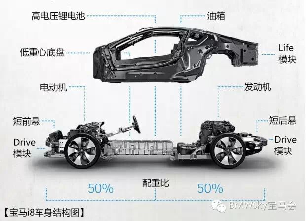 宝马i系列车型都采用了“LifeDrive”模块架构,这台i8自然不会例外,通俗点说,“Life”模块代表驾驶舱,其外壳由CFRP(碳纤维增强复合材料)制成,其中包含座椅、内饰以及电气设备等;而“Drive”模块则由底盘、悬架、电池组、驱动系统等等纳入其中,主要负责车辆行驶及电气设备的正常使用。