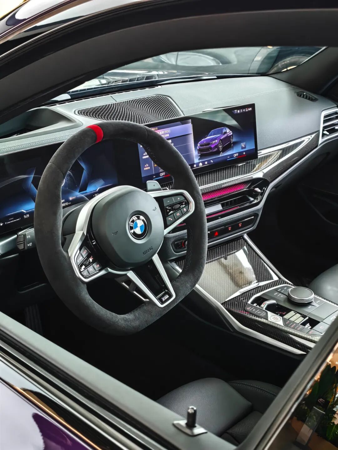 Alcantara材质的方向盘,这是首次在国产3系上应用,12点位置还有红色回正标,毫无疑问对手感是一大提升。