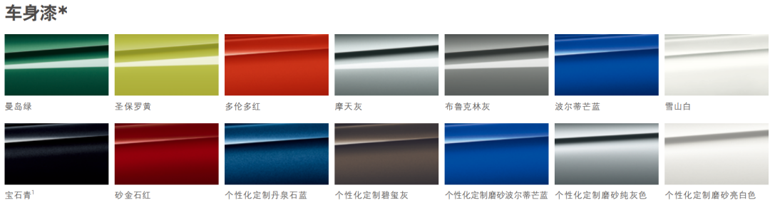 车漆方面,标配曼岛绿、圣保罗黄、多伦多红、摩天灰、布鲁克林灰、波尔蒂芒蓝、雪山白、宝石青、砂金石红,可以个性化定制丹泉石蓝(10100)、碧玺灰(10100)、磨砂波尔蒂芒蓝(23200)、磨砂纯灰色(23200)、磨砂亮白色(23200)以及个性化定制特别涂装(35000)。