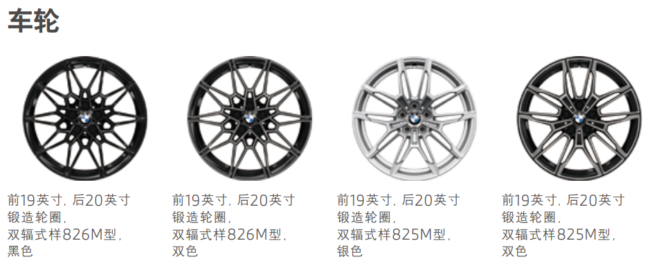 轮毂方面,标配826M 黑色,可以0元选装826M 双色,还可以3500元选装825M(银色或双色)。