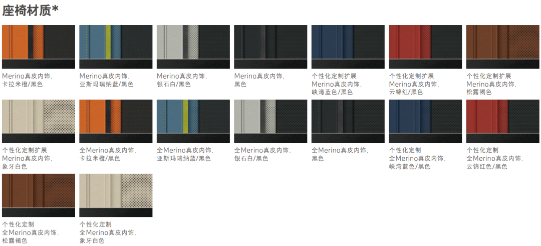 内部座椅材质也有很多样式可选,Merino真皮标配的有黑色、卡拉米橙/黑色、亚斯玛瑞纳蓝/黑色、银石白/黑色;扩展Merino真皮标配的有峡湾蓝色/黑色、云锦红/黑色、松露褐色、象牙白色;此外还可以花钱选装各种全Merino真皮内饰。