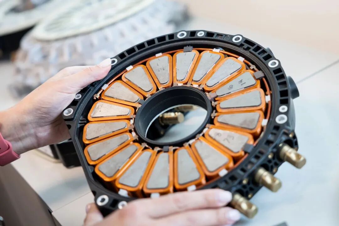 这就是所谓的轴向磁通电机,别被名字吓到了,其实可以理解成,将传统电机的圆筒状拍成圆饼状,扁平结构让它在功率密度、散热效率、空间利用率上都有天然优势。