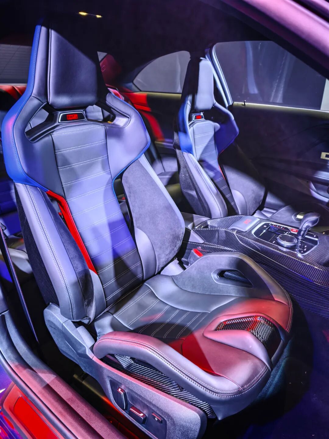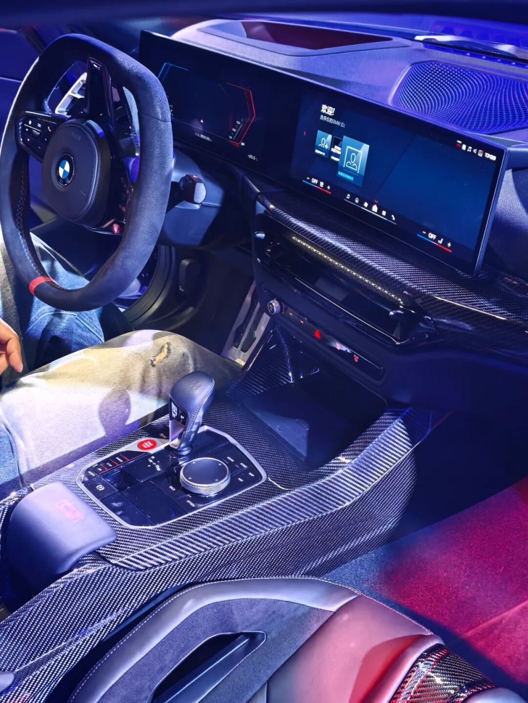 Alcantara方向盘,这整体的氛围可以说是非常到位了。M碳纤维桶椅是标配的,能够提供非常好的包裹性,对于这么硬核的一台车来说也是应该标配的。