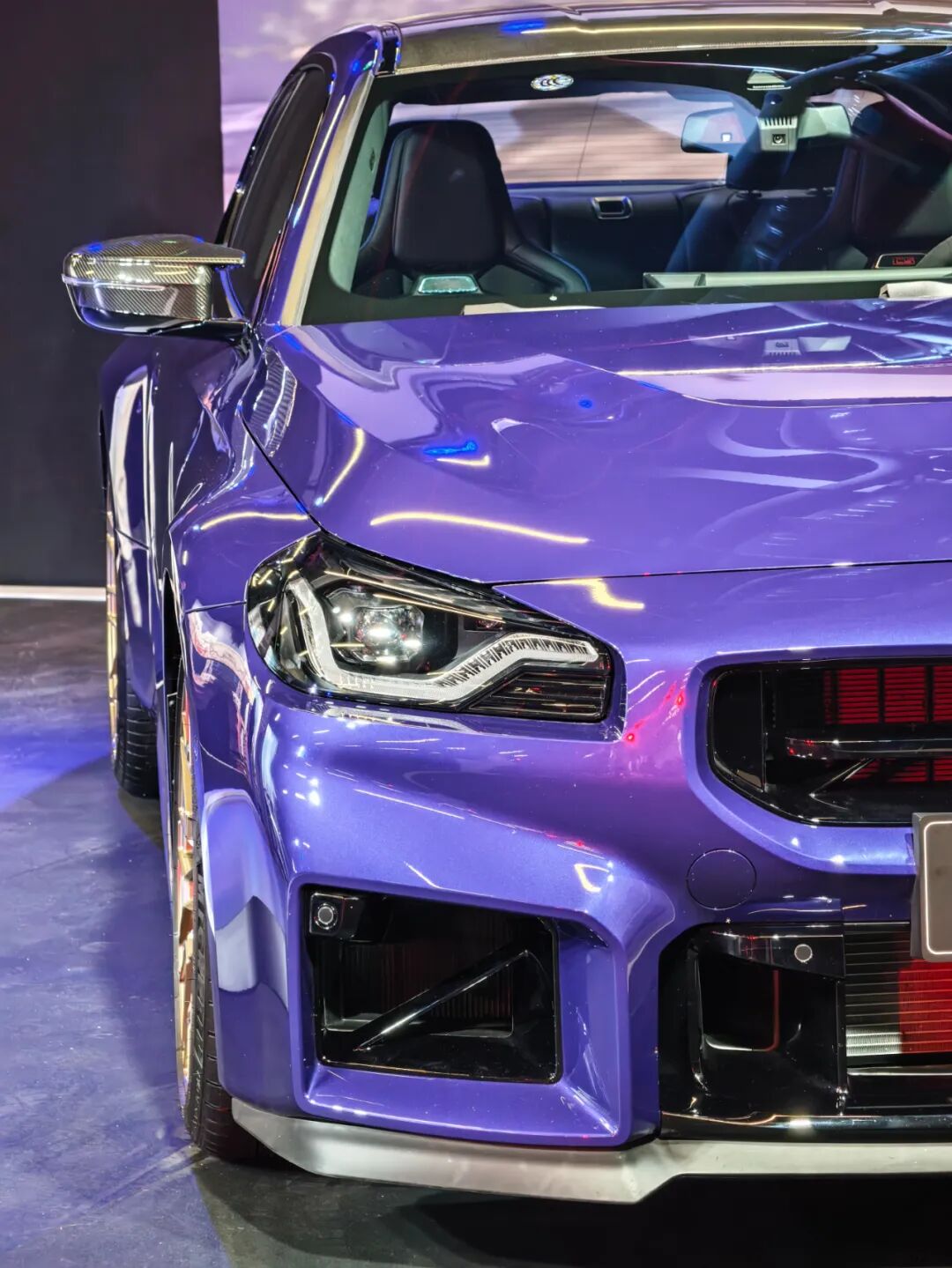 G87 M2 CS在设计上相比于普通M2有一些变化,比如双肾格栅的进气更大,且带有红色标识。新加入了一个前唇,但它不是碳纤维也不是高亮黑色,而是橡胶材质的,关于此官方的解释是:底盘较低容易剐蹭,碳纤维不如橡胶件更稳妥一些,万一有磕碰也不心疼,真实在人。比较可惜的一点是原厂M2 CS并没有大哥们的黄色日行灯,这都不是事,后期搞一下就行。