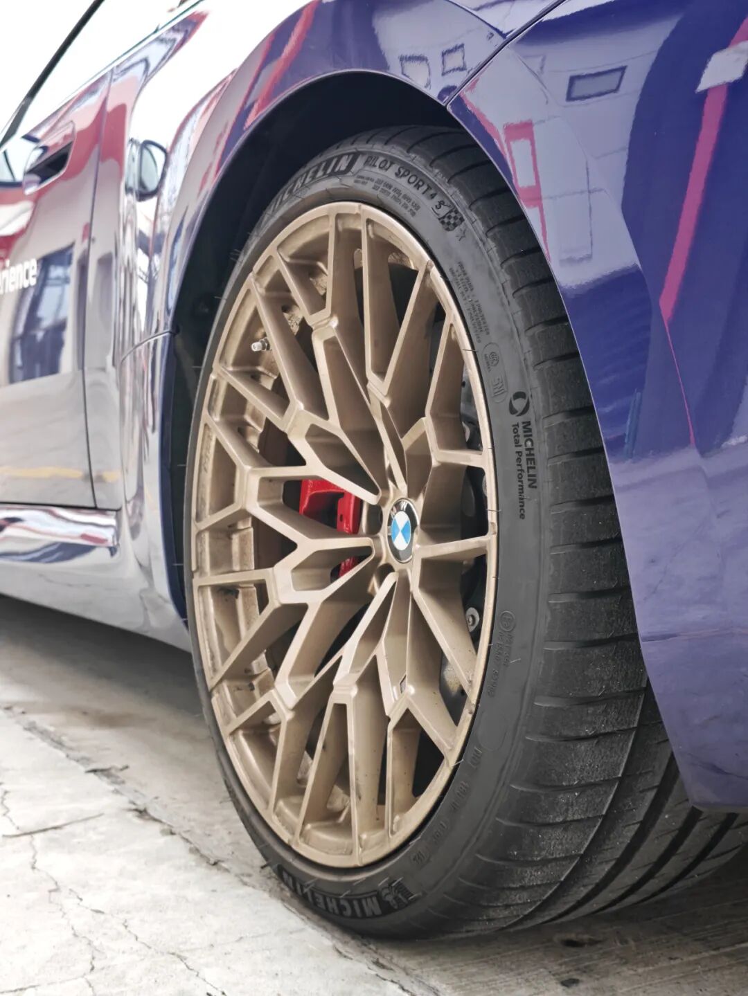 轮毂配备的是和M3 CS和M4 CS同款的哑光金铜色827M轮毂,轮胎尺寸为前275/35 ZR19、后285/30 ZR20。有人觉得这是1000M轮毂,其实只是看起来像,实际上并不是,1000M属于MPP官方改装件。